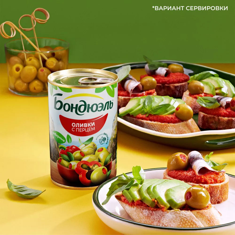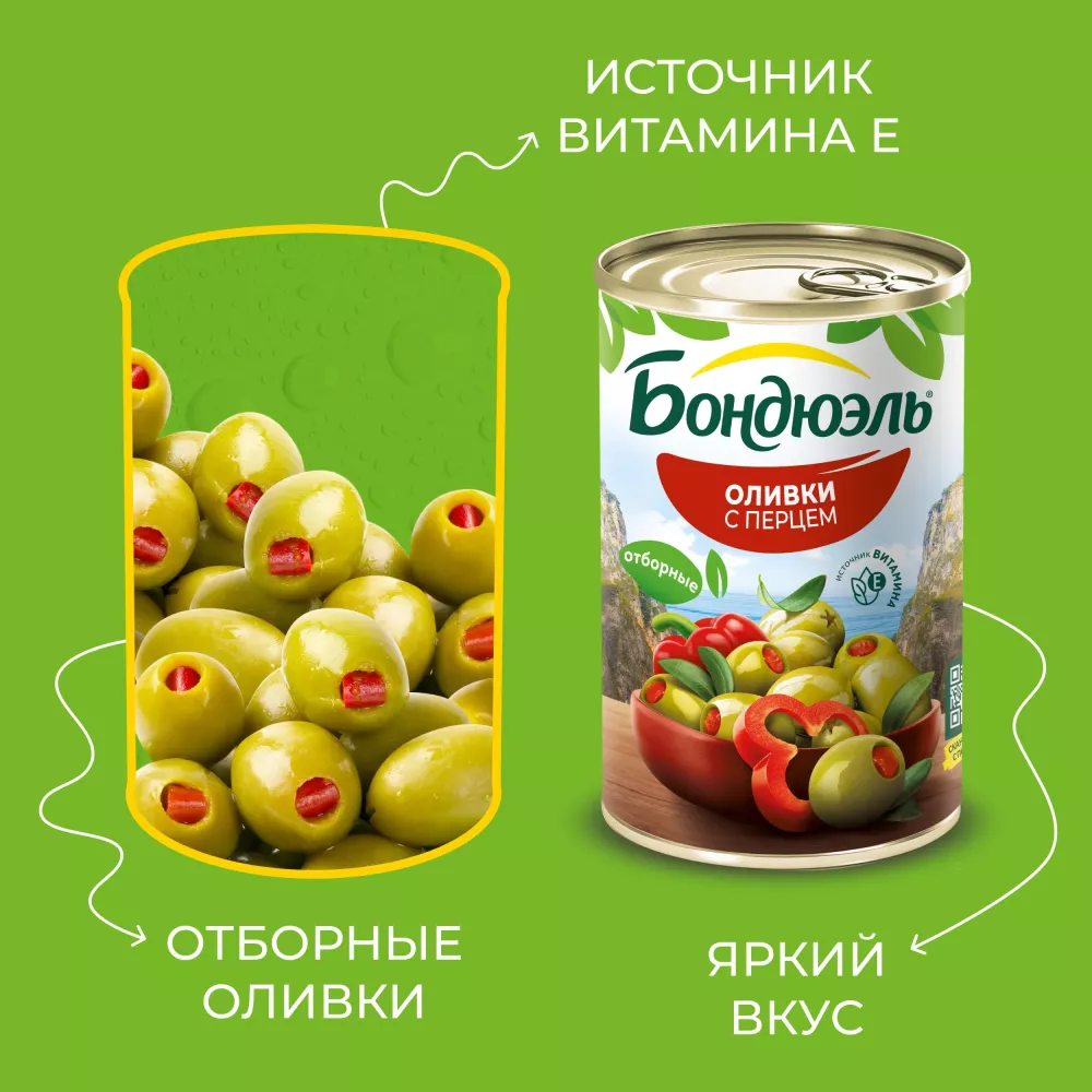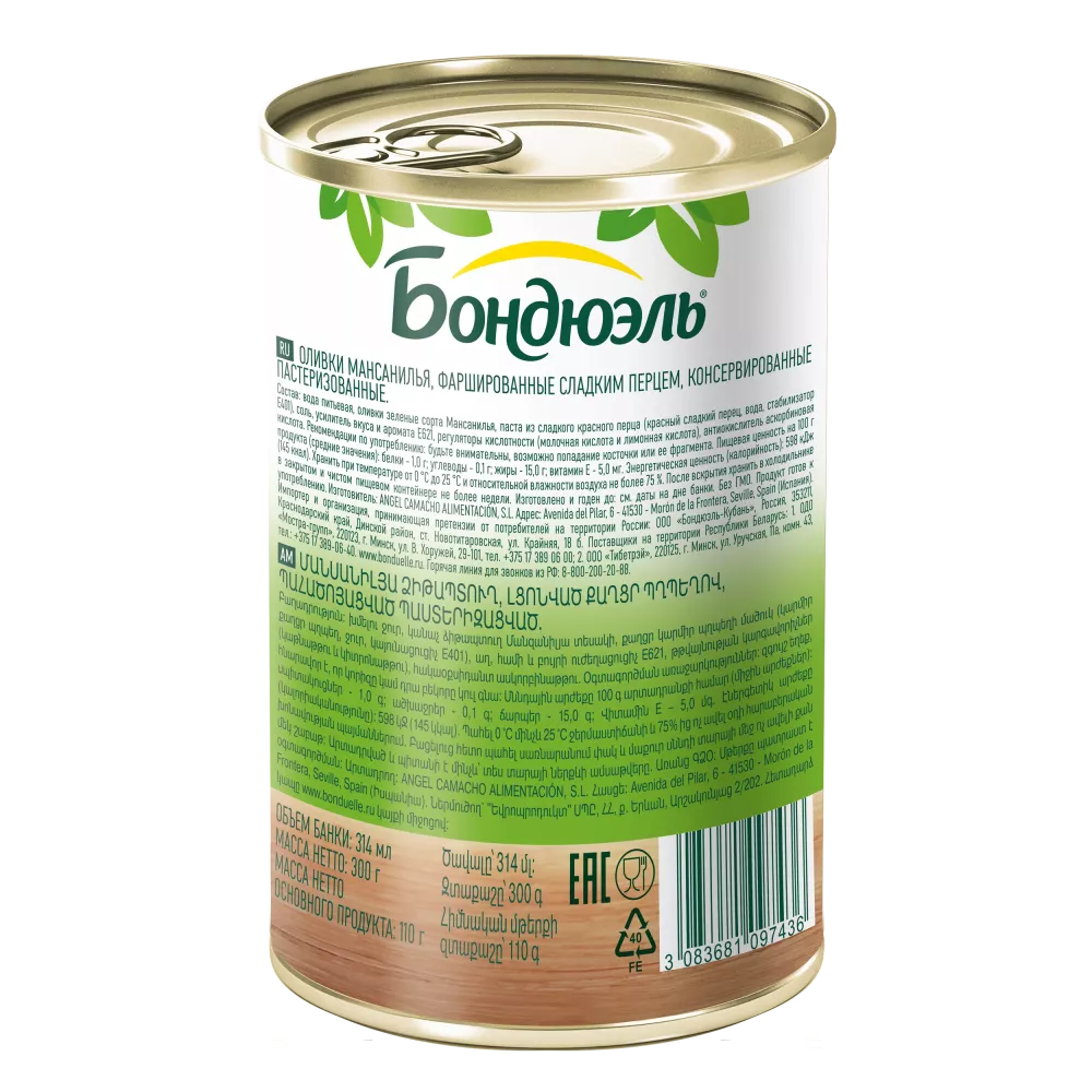 Состав: вода питьевая, оливки зеленые сорта Мансанилья, паста из сладкого красного перца (красный сладкий перец, вода, стабилизатор E401), соль, усилитель вкуса и аромата E621, регуляторы кислотности (молочная кислота и лимонная кислота), антиокислитель аскорбиновая кислота.